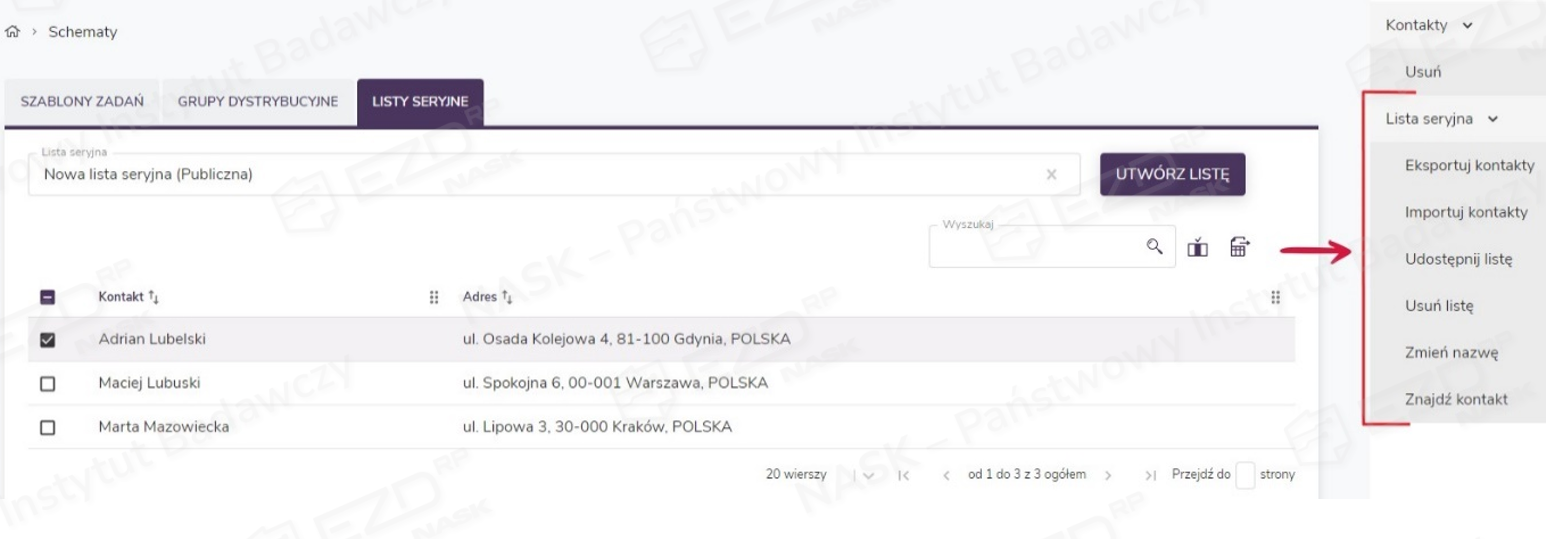 Opcje pozwalające na edycję list seryjnych dostępne są w bocznym menu po wskazaniu istniejącej listy seryjnej.