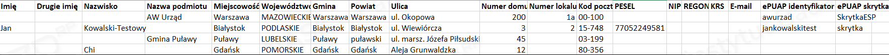 Aby wykonać taką operację, należy w arkuszu kalkulacyjnym przygotować listę z niezbędnymi danymi adresowymi. Wprowadzane informacje należy umieszczać w odpowiednich kolumnach, takich jak w udostępnionym szablonie do importu kontaktów. Formularz importu kontaktów – list seryjnych można pobrać ze strony Wzory i szablony (sekcja Konfiguracja systemu). Po zapisaniu arkusza w formacie CSV przygotowany plik wykorzystujemy do importu danych.