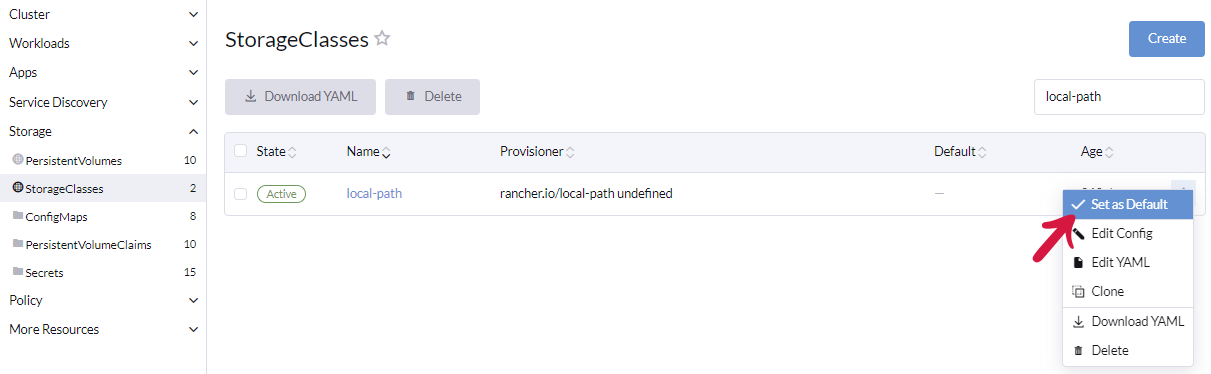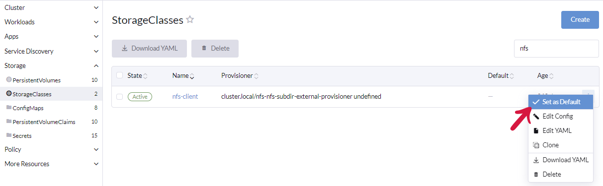 Przed instalacją trzeba ustawić domyślny storage sekcji Storage klikamy zakładkę StorageClasses i wybieramy local-path(dla instalacji z bazą danych H2) dla instalacji z bazami Postgres oraz MS SQL wybieramy StorageClasses o nazwie nfs-client w tym celu klikamy ikonę menu podręcznego (trzy kropki). Następnie spośród dostępnych opcji wybieramy Set as Default.