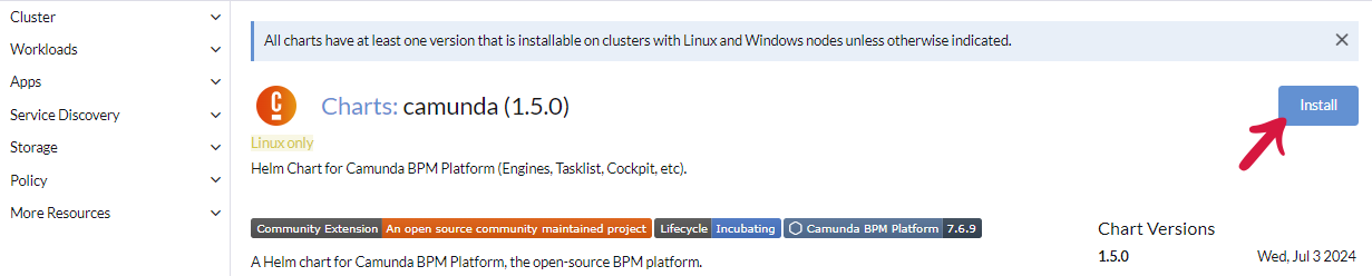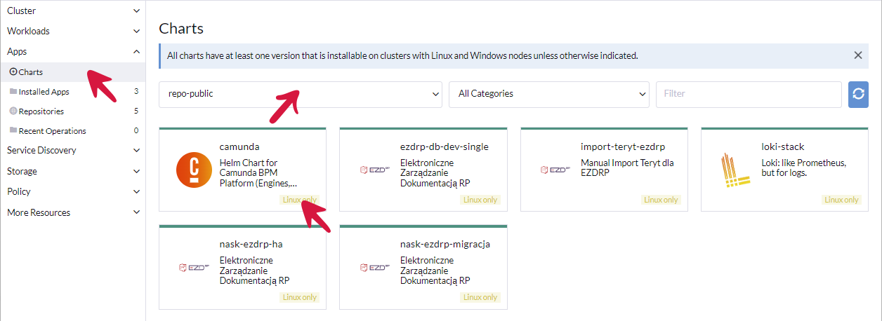 Aby wyświetlić listę dostępnych aplikacji, które możemy zainstalować na klastrze, należy wybrać opcję Apps, a następnie Charts. Zostanie wyświetlony wykaz dostępnych aplikacji, który możemy przeglądać i wybrać interesujące nas aplikacje do instalacji na klastrze. Warto zawęzić wynik wyszukiwania przy użyciu filtra. Wskazujemy tylko nasze publiczne repozytorium. Z listy dostępnych aplikacji wybieramy Camundę.