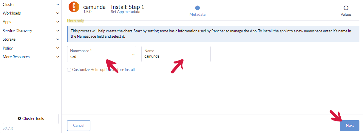 Przy wyborze przestrzeni nazw do instalacji Camundy należy wskazać w odpowiednim polu ten sam namespace, w którym znajduje się już EZD RP. Następnie podajemy nazwę aplikacji. W polu Name podajemy nazwę camunda. Wprowadzone zmiany zatwierdzamy przyciskiem Next.