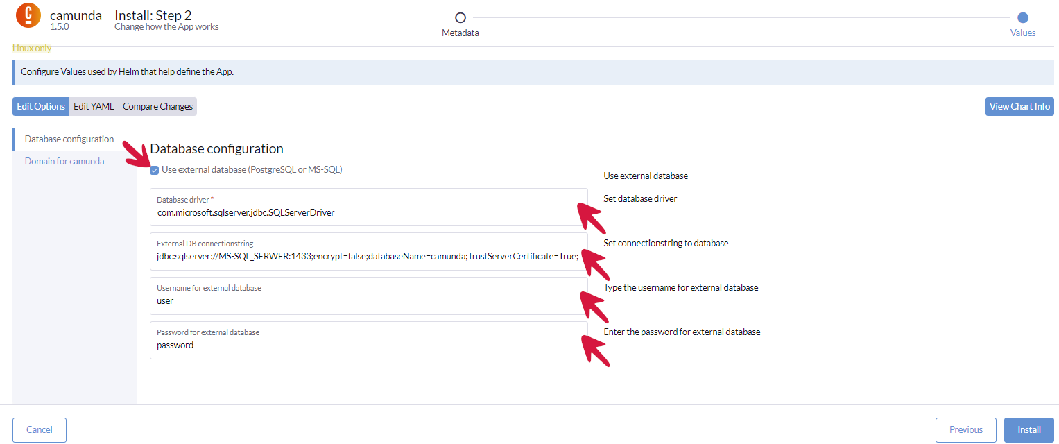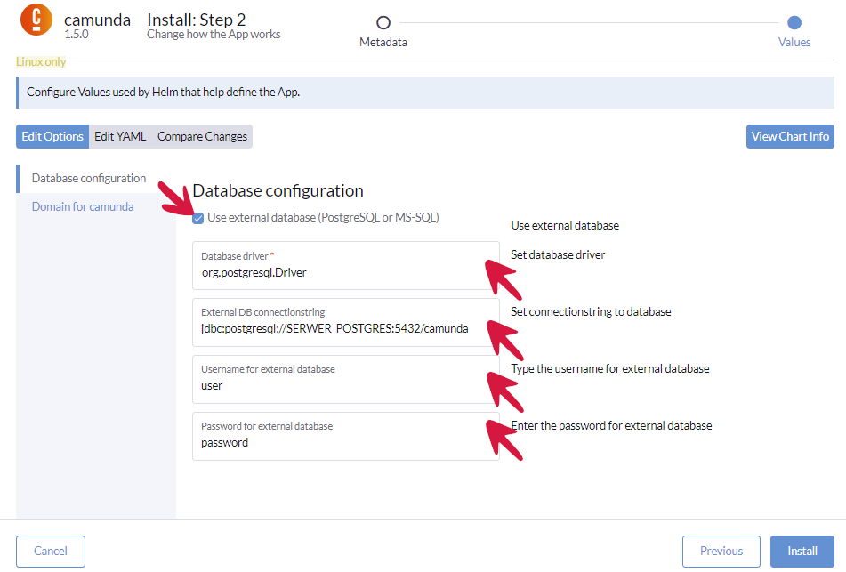 W celu zainstalowania Camundy z jej wbudowaną bazą danych H2 wystarczy nie wypełniać Database configuration, czyli nie zaznaczać pola wyboru Use external database, a w polu Set domain for camunda wpisujemy nazwę domeny i nazwę secretu z certyfikatem który już jest w systemie (ten sam co dla EZD RP). Klikamy przycisk Install.