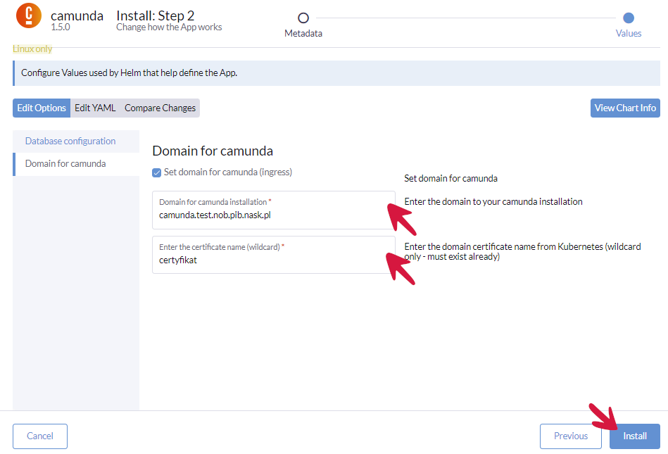 Jeśli potrzebujemy wystawić webową konsolę Camundy poprzez ingress, należy przejść do zakładki Domain for camunda i zaznaczyć pole wyboru przy opcji Set domain for camunda. Podajemy potrzebne dane, czyli nazwę domeny oraz nazwę sekretu z certyfikatem, który już jest w systemie (ten sam co dla EZD RP). Klikamy przycisk Install, aby zakończyć proces instalacji.