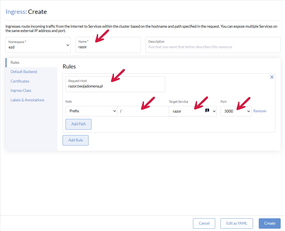 Wypełniamy pola Name, Request Host, Prefix, Target Service, Port.
