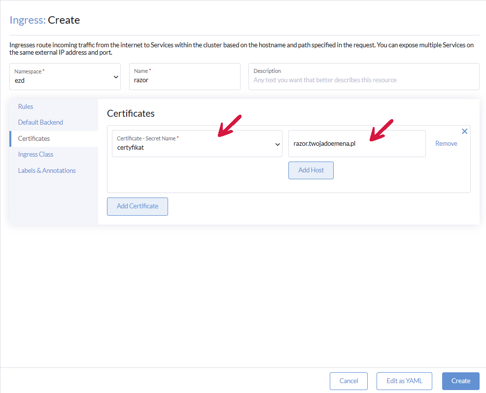 ingress.secretName=certyfikat – parametr ingress.secretName powinien zawierać nazwę sekretu, w którym znajduje się certyfikat dla domeny, na której działa już EZD RP; w naszych instalacjach zwykle ta nazwa to po prostu „certyfikat”.