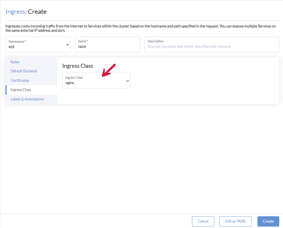 W dalszej kolejności, należy dodać ingress z bocznego menu wybieramy Service Discovery > Ingresses przyciskami Create.