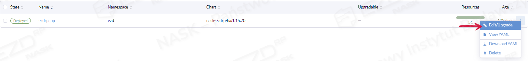 W celu włączenie procesowości należy przejść do widoku Apps > Installed apps w Rancherze, wybieramy naszą aplikację i w menu kontekstowym klikamy opcję Edit/Upgrade.