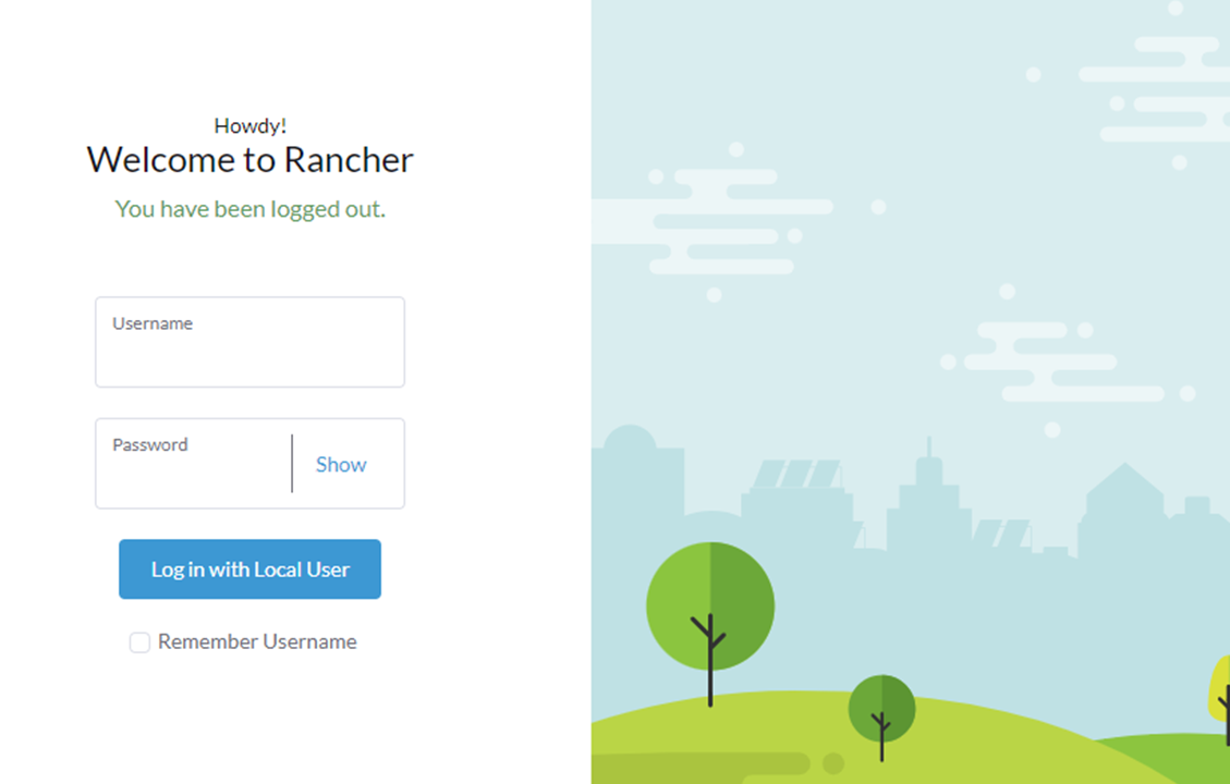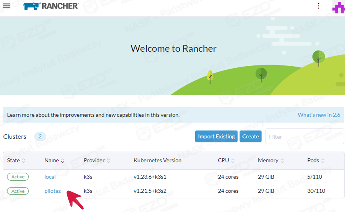 Proces aktualizacji należy rozpocząć od zalogowania się do Ranchera za pomocą dowolnej przeglądarki. Zainstalowany Rancher dostępny będzie pod adresem: https://ip_serwera:8443. Po zaakceptowaniu certyfikatu wyświetli się strona strona powitalna Ranchera.