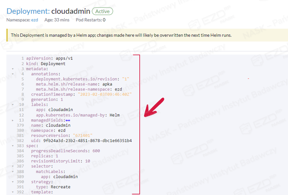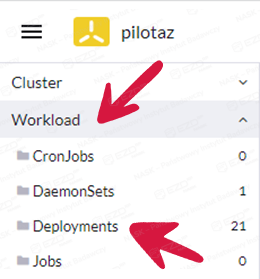 Po wykonaniu archiwizacji środowiska EZD RP (backupu), wykonujemy kopię Cloudadmin. W tym celu należy wybrać Workloads > Deployments.
