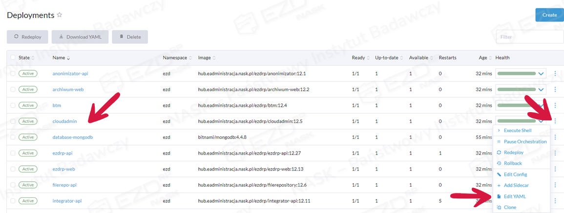 Następnie wybieramy Cloudadmin, klikamy ikonę menu podręcznego (trzy kropki) i opcję Edit YAML.