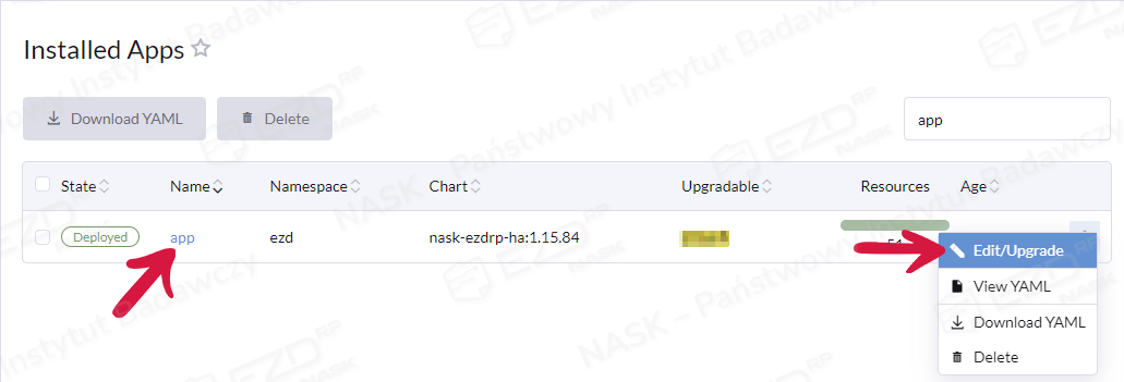 Zaznaczamy aplikację (w naszym przykładzie o nazwie app), klikamy ikonę menu podręcznego (trzy kropki) i wybieramy opcję Edit/Upgrade.