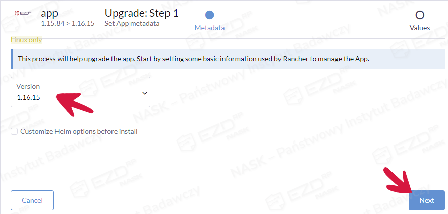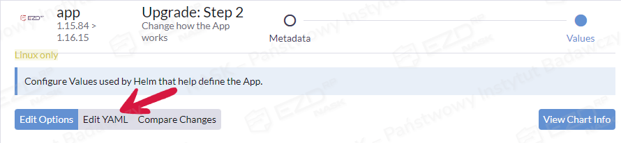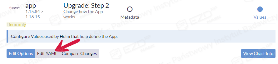 Po kliknięciu Next przechodzimy do zakładki Edit YAML i modyfikujemy linijkę force_chown, zmieniając parametr na false.