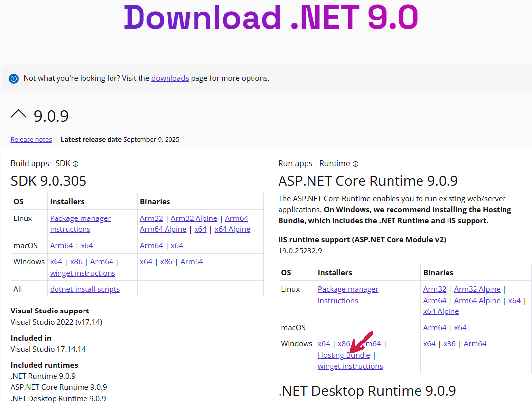 Instalujemy oprogramowanie .NET Core 9 Core Runtime (Hosting Bundle).