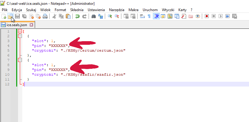 W folderze seal-web użytkownik modyfikuje plik ice.seals.json i wprowadza PIN w linijce dedykowanej dla posiadanego dostawcy podpisu.