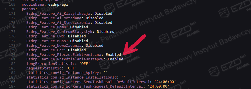 Kolejno wyszuku linijki Ezdrp_Feature_PieczecElektroniczna i zmienia atrybut na Enabled