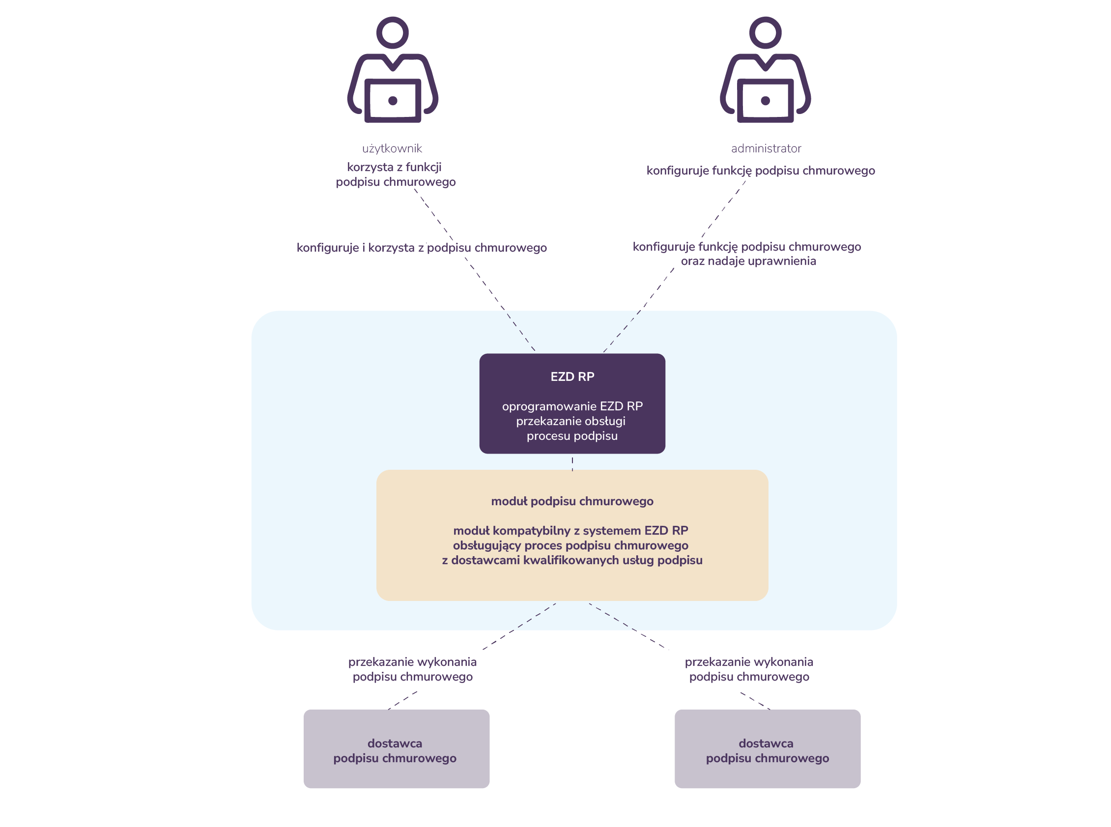 - instalacja modułu pośredniczącego w środowisku systemu EZD RP, co umożliwia bezpośredni dostęp do funkcji podpisu chmurowego;