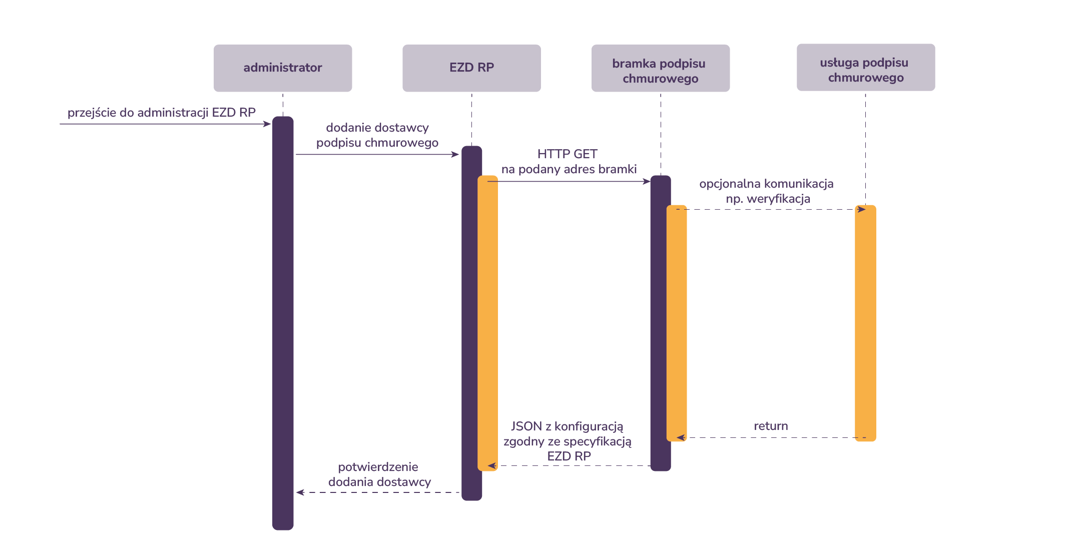 Poniższy diagram przedstawia etap dodawania dostawcy podpisu chmurowego przez administratora podmiotu w EZD RP. Szczegółowy opis działania integracji w zakresie dodawania dostawcy znajduje się w sekcji „Rejestracja dostawcy” umieszczonej w dalszej części artykułu.