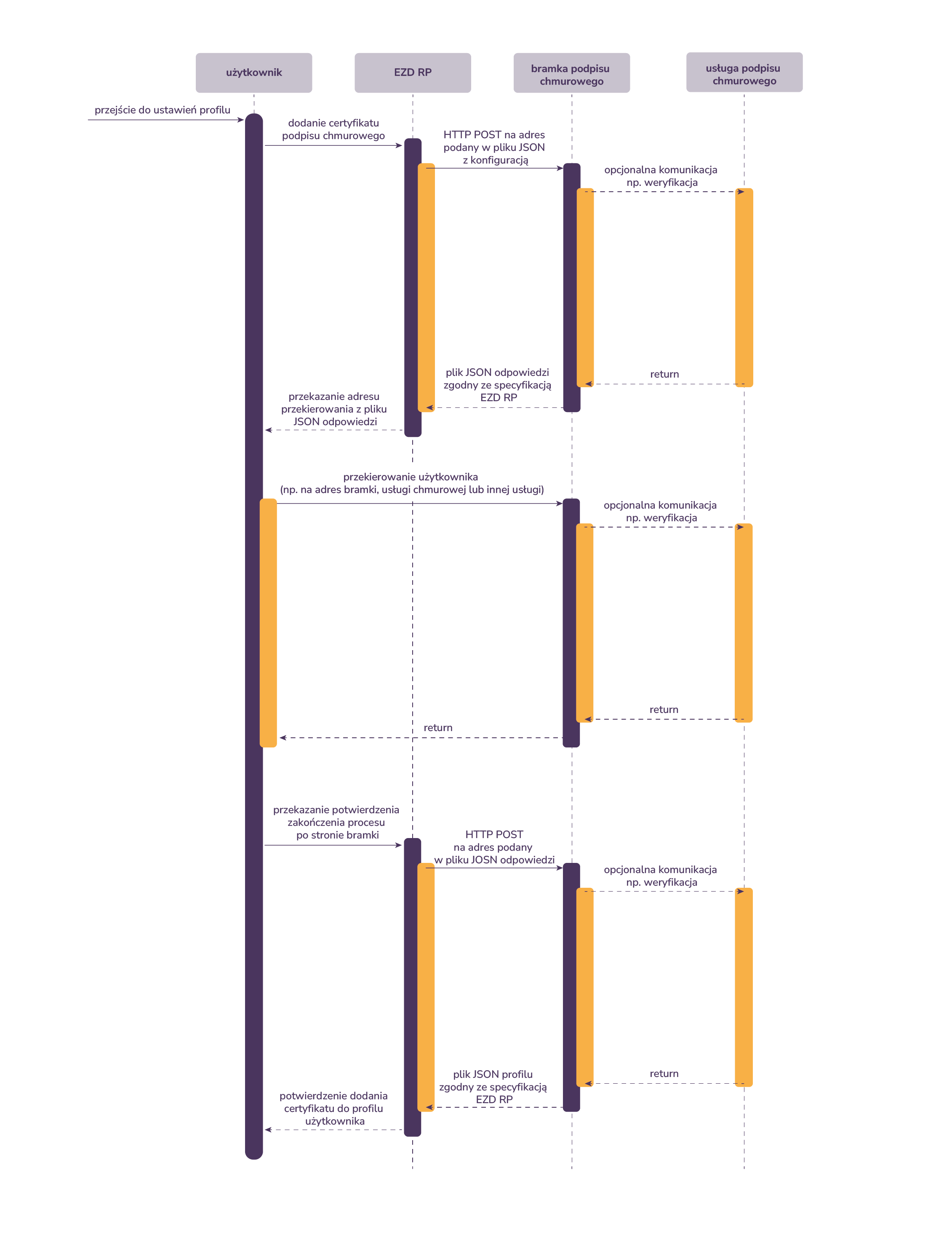 Poniższy diagram przedstawia etap konfiguracji certyfikatu podpisu chmurowego w profilu użytkownika EZD RP. Szczegółowy opis działania integracji w zakresie dodawania certyfikatu podpisu chmurowego znajduje się w sekcji „Konfiguracja użytkownika” umieszczonej w dalszej części artykułu.