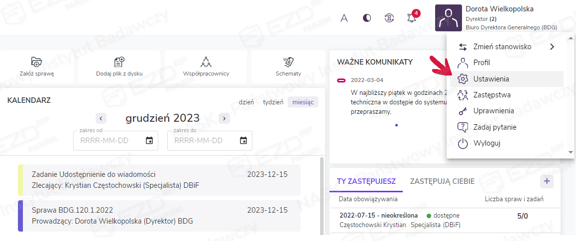 Aby dodać podpis, należy kliknąć Profil użytkownika i wybrać z listy pozycję Ustawienia.