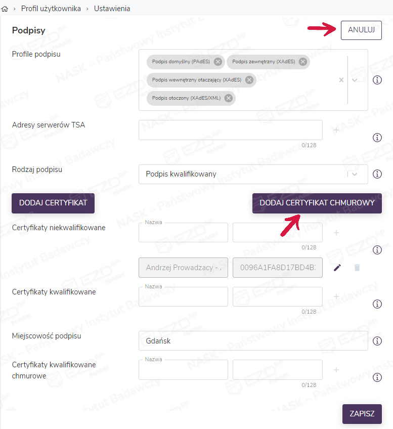 Następnie w sekcji Podpisy klikamy przycisk Edytuj, który zmieni się na przycisk Anuluj. Pod polem z rodzajem podpisu pojawi się przycisk umożliwiający dodanie certyfikatu chmurowego.