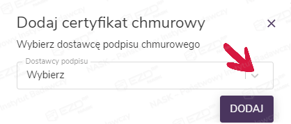 Po kliknięciu przycisku Dodaj certyfikat chmurowy pojawi się okno umożliwiające wybór dostawcy podpisu chmurowego spośród wcześniej zdefiniowanych przez administratora.
