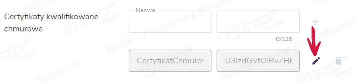 Nazwę dodanego certyfikatu chmurowego można edytować. Aby to zrobić, należy w sekcji Podpisy kliknąć przycisk Edytuj, a następnie kliknąć ikonę edycji widoczną po prawej stronie, przy nazwie certyfikatu.