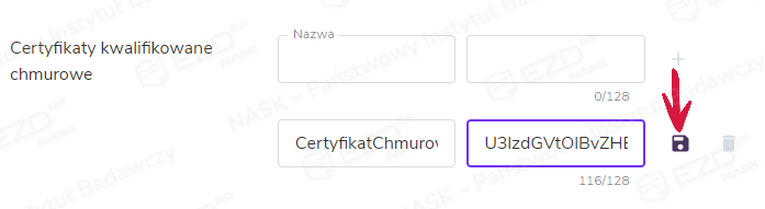Aby usunąć certyfikat, należy skorzystać z ikony kosza, która znajduje się obok ikony dyskietki. Po jej kliknięciu system wyświetli komunikat potwierdzający usunięcie certyfikatu.