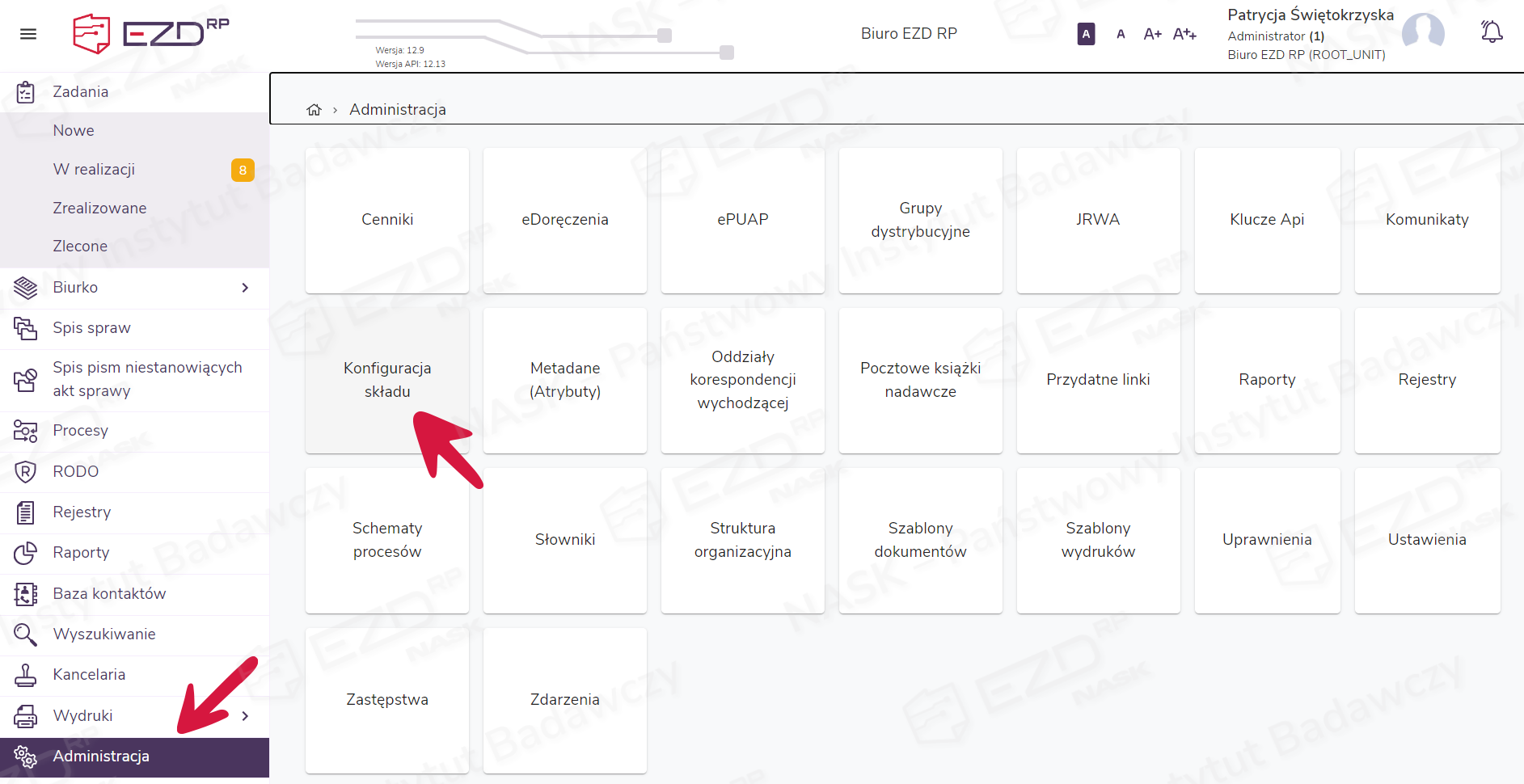 W systemie EZD RP konfiguracja składu chronologicznego odbywa się w dwóch krokach. Aby je wykonać, należy wybrać w menu głównym moduł Administracja, a następnie kliknąć kafelek Konfiguracja składu.