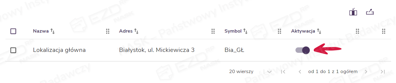 Nowa lokalizacja jest ustawiona automatycznie jako nieaktywna. Aby lokalizacja stała się widoczna dla użytkowników, należy kliknąć suwak w kolumnie Aktywacja, który zmieni kolor i pozycję (przesunie się w prawą stronę).