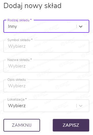 Po wybraniu rodzaju składu pojawią się kolejne pola, gdzie należy dodać informacje na jego temat: symbol, nazwę, opis i lokalizację. Tę ostatnią należy wybrać z rozwijanej listy, wskazując jedną z wcześniej dodanych pozycji.
