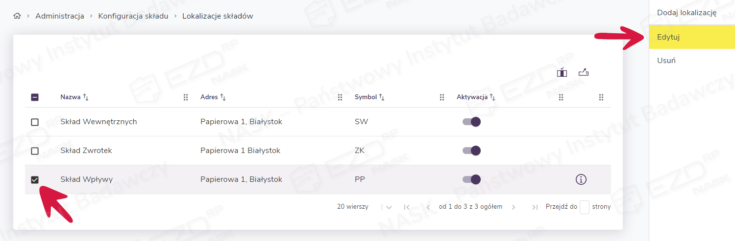 Do lokalizacji składów należy przypisać pracowników. W tym celu klikamy kafelek Lokalizacje składów w module Administracja > Konfiguracja składów. Następnie na liście z lokalizacjami należy zaznaczyć pole wyboru przy wybranej pozycji, a w menu kontekstowym po prawej stronie ekranu kliknąć opcję Edytuj.