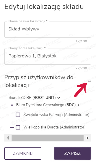 Aby usunąć pracownika z listy, zaznaczamy pole wyboru przy danym składzie, wybieramy funkcję Edytuj, rozwijamy listę w polu Przypisz użytkowników do lokalizacji, odznaczamy pole wyboru przy nazwisku pracownika i klikamy przycisk Zapisz.