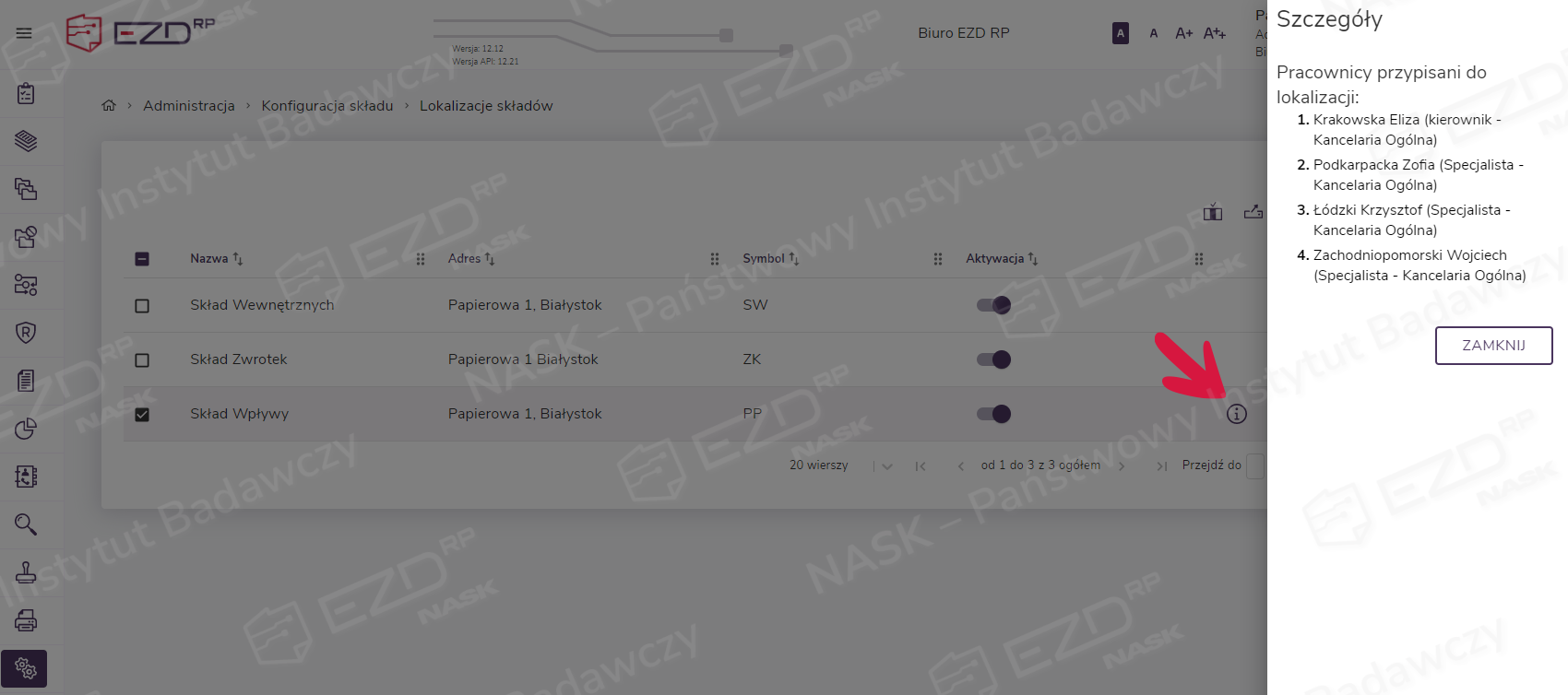 Listę pracowników dodanych do składu można zobaczyć w panelu bocznym, który wyświetli się po kliknięciu ikony informacji umieszczonej na końcu wiersza z nazwą składu.