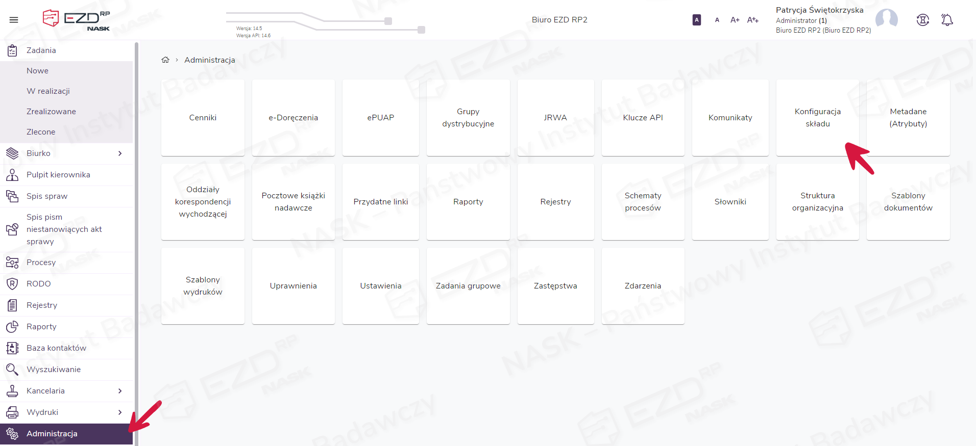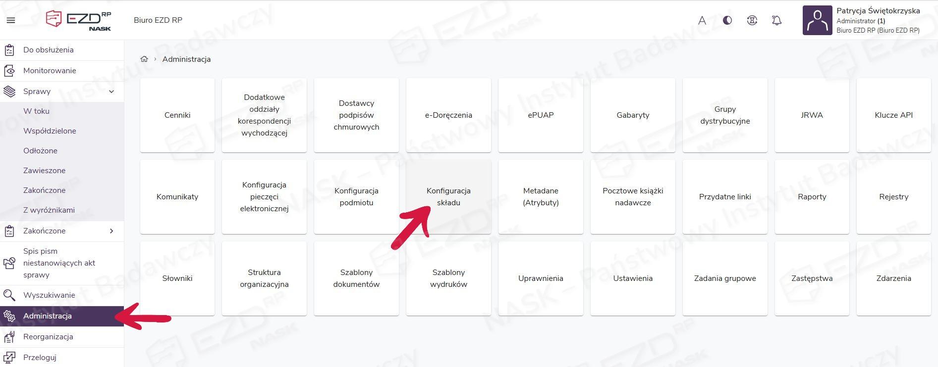 W systemie EZD RP konfiguracja składu chronologicznego odbywa się w dwóch krokach. Aby je wykonać, należy wybrać w menu głównym moduł Administracja, a następnie kliknąć kafelek Konfiguracja składu.