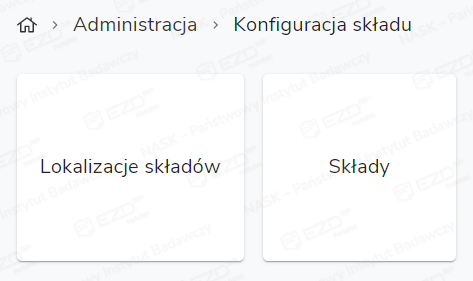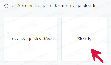Aby zdefiniować składy wykorzystywane w instytucji, należy w widoku Administracja > Konfiguracja składu kliknąć kafelek Składy.