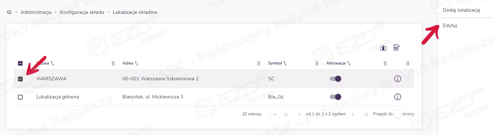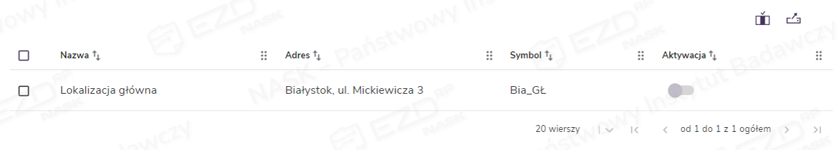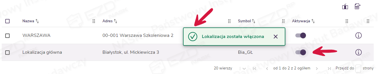 Nowa lokalizacja jest ustawiona automatycznie jako nieaktywna. Aby lokalizacja stała się widoczna dla użytkowników, należy kliknąć suwak w kolumnie Aktywacja, który zmieni kolor i pozycję (przesunie się w prawą stronę). O włączeniu lokalizacji informuje komunikat systemowy.