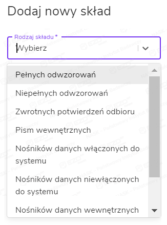 Chcąc dodać nowy skład, w menu kontekstowym po prawej stronie należy wybrać funkcję Dodaj skład. Otworzy się panel boczny Dodaj nowy skład, gdzie z listy rozwijanej wybieramy odpowiedni rodzaj składu.