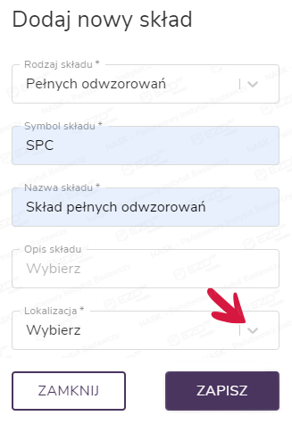 Po wybraniu rodzaju składu pojawią się kolejne pola, gdzie należy dodać informacje na jego temat: symbol, nazwę, opis i lokalizację. Tę ostatnią należy wybrać z rozwijanej listy, wskazując jedną z wcześniej dodanych pozycji.