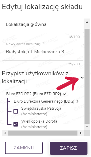 W panelu edycji klikamy symbol rozwijania przy pozycji Przypisz użytkowników z lokalizacji. Wyświetli się struktura podmiotu. Należy zaznaczyć właściwych dla wybranej lokalizacji pracowników i całość zatwierdzić przyciskiem Zapisz.