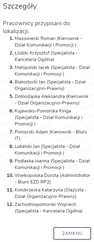 Listę pracowników dodanych do składu można zobaczyć w panelu bocznym, który wyświetli się po kliknięciu ikony informacji umieszczonej na końcu wiersza z nazwą składu.