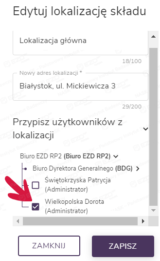 Aby usunąć pracownika z listy, zaznaczamy pole wyboru przy danym składzie, wybieramy funkcję Edytuj, rozwijamy listę w polu Przypisz użytkowników z lokalizacji, odznaczamy pole wyboru przy nazwisku pracownika i klikamy przycisk Zapisz.
