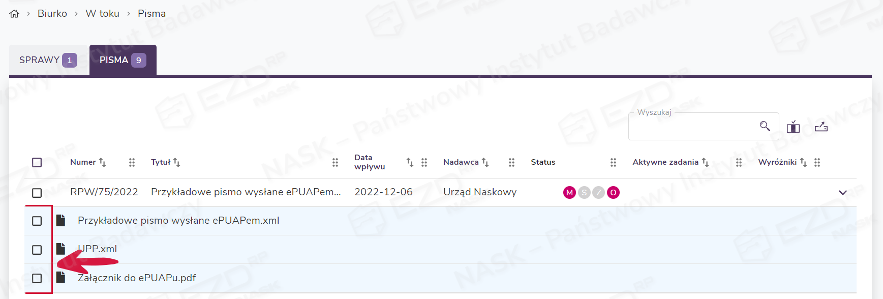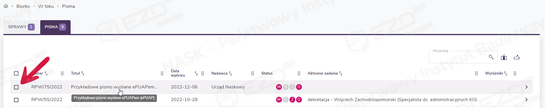 Pismo wysłane przez ePUAP trafi na konto wskazanego użytkownika do sekcji Biurko > W toku > Pisma.