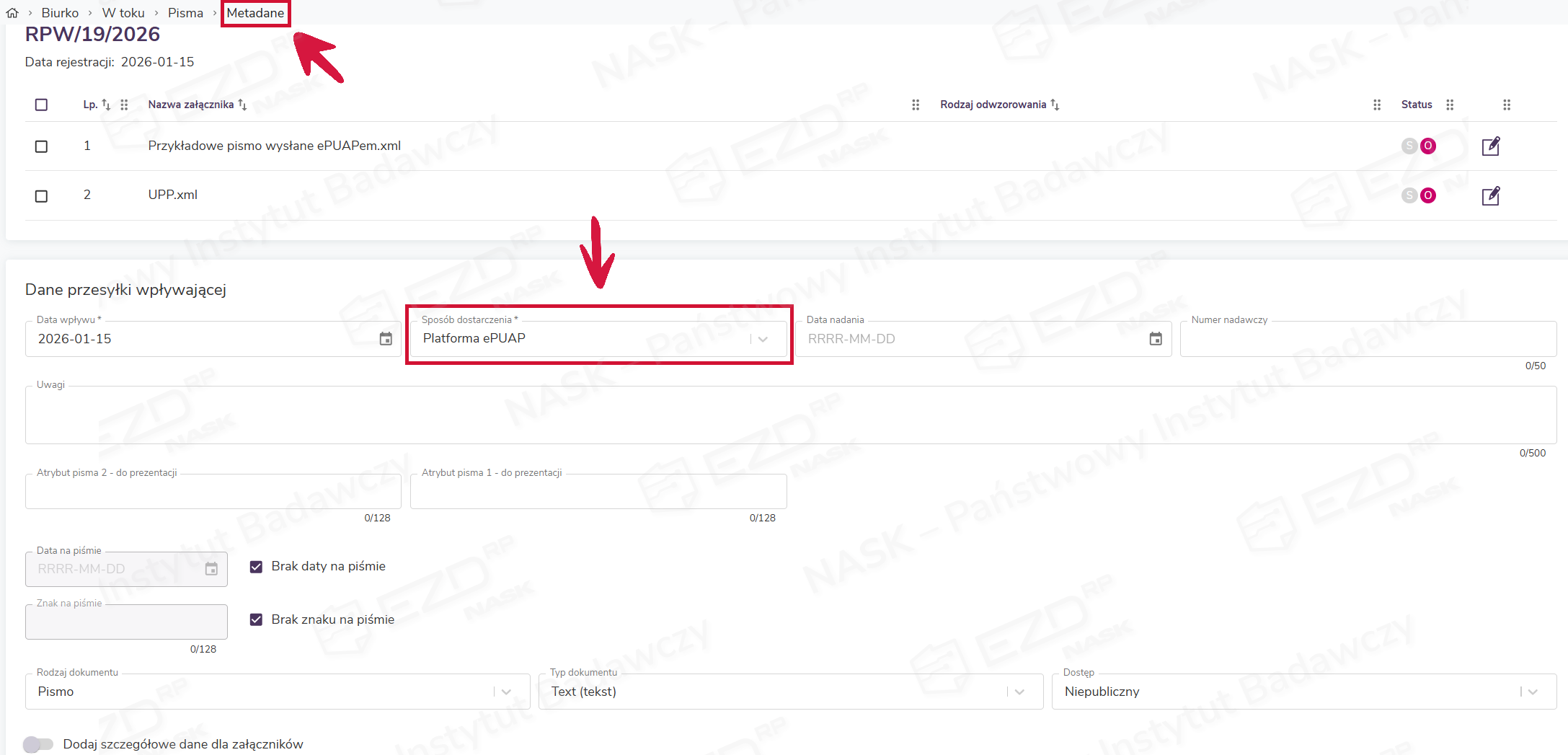W systemie EZD RP metadane przesyłki otrzymanej tym kanałem komunikacji są automatycznie uzupełniane danymi otrzymanymi z platformy ePUAP.