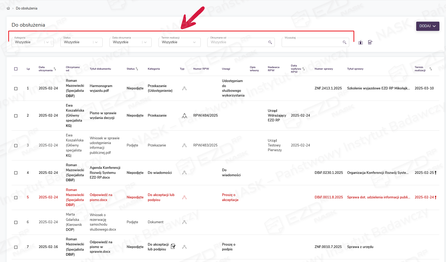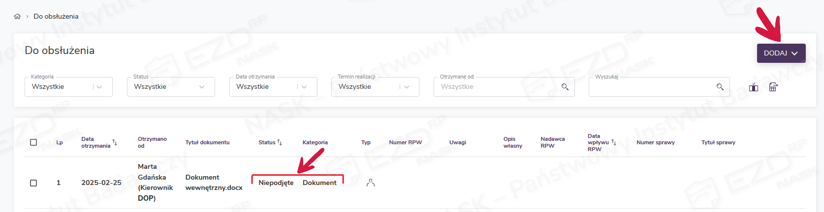 Listę obiektów i zadań użytkownik może filtrować przy użyciu pól dostępnych w górnej części modułu Do obsłużenia. W polu Kategoria możliwe filtrowanie według następujących pozycji: Dokument, Przekazanie, Do akceptacji lub podpisu, Do wiadomości, Udostępnienie, Procesowość, Do poprawy, Kopia. Dodatkowo można filtrować przy pomocy pól: Status, Data otrzymania, Termin realizacji, Otrzymano od oraz Wyszukaj.
