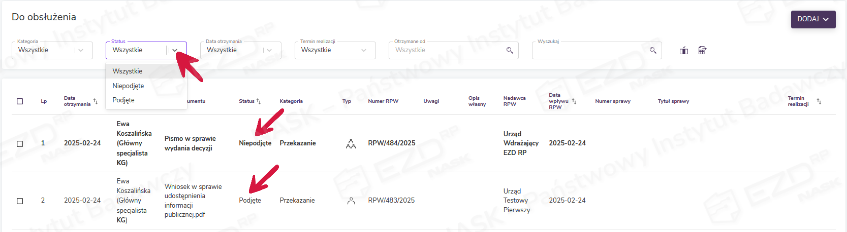 Filtrowanie z użyciem pola Status pozwala na wyświetlenie listy obiektów, które zostały już podjęte przez użytkownika, oraz takich, z którymi odbiorca jeszcze się nie zapoznał. Obiekty nowe, do których pracownik dotychczas nie zajrzał, posiadają status Niepodjęte i prezentowane są pogrubioną czcionką. Zadania, których szczegóły użytkownik wyświetlił, posiadają natomiast status Podjęte.