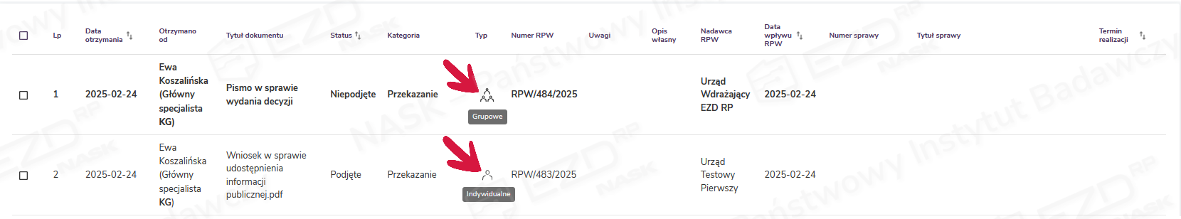 Ikony prezentowane w kolumnie Typ informują odbiorcę, czy otrzymany obiekt został wystawiony jako zadanie indywidualne, czy też grupowe.