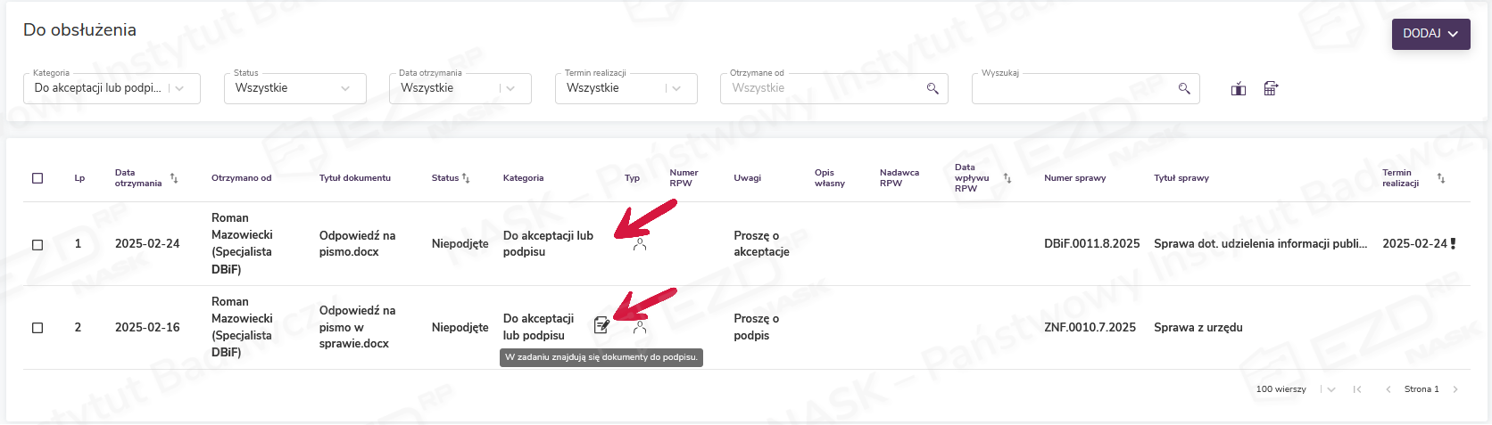 W kolumnie Kategoria przy zadaniu Do akceptacji lub podpisu może pojawić się ikona informująca użytkownika, że w obiekcie znajdują się dokumenty do podpisu. W sytuacji gdy podejmujący zadanie został wskazany przez wystawiającego jako osoba akceptująca, ikony nie będzie.
