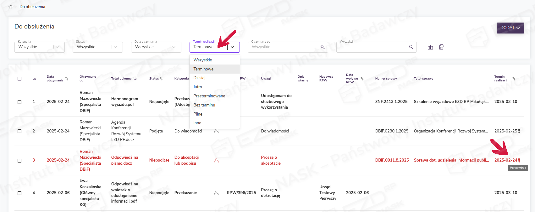 Jeśli wystawiający zadanie wskaże konkretny termin realizacji, wówczas u odbiorcy zadania data ta będzie wyświetlana w kolumnie Termin realizacji. W zależności od wskazanego terminu zadanie może być oznaczone ikoną wykrzyknika jako: Pilne, Na dziś lub Po terminie. Zadania, w przypadku których wskazany termin upłynął, prezentowane są czcionką w kolorze czerwonym.