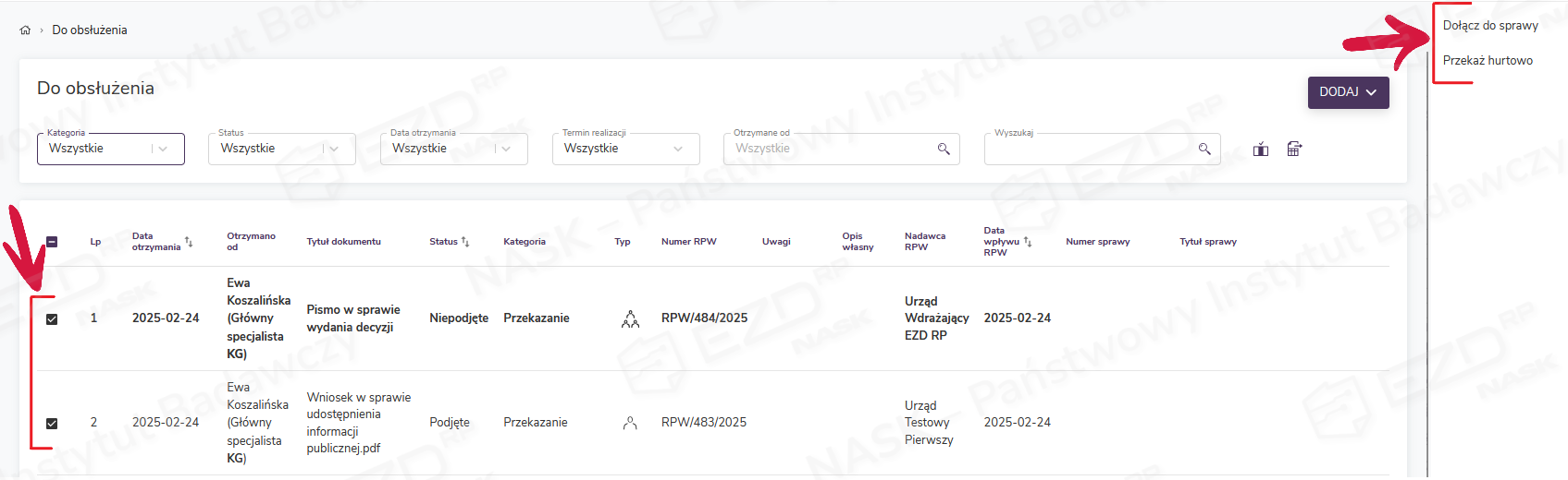 Z poziomu listy Do obsłużenia możliwe jest wykonywanie dla wybranych kategorii czynności hurtowych. Po oznaczeniu pól wyboru przy obiektach należących do kategorii Dokument, Przekazanie, Kopia, Udostępnienie użytkownik ma w prawym menu możliwość ich hurtowego przekazania lub dołączenia do sprawy.