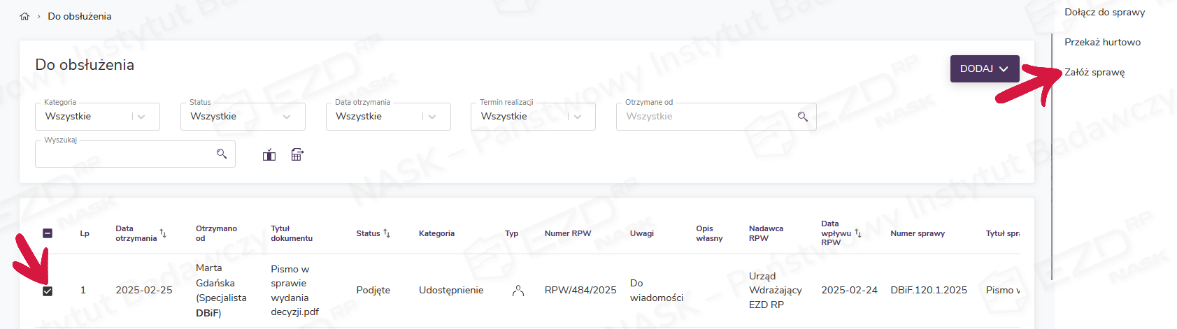 W zależności od kategorii zadania w przypadku zaznaczenia pola wyboru przy jednej pozycji w prawym menu może być również dostępna opcja Załóż sprawę.